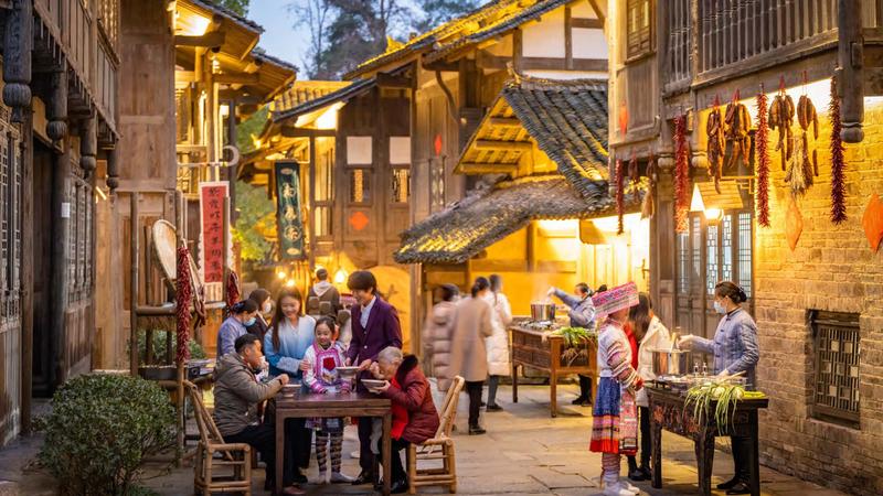 The destination is organised into distinct street districts and experience zones, each offering a different lens on Guizhou’s culture. Visitors move through hillside paths, riverside promenades, and courtyard clusters that combine traditional architectural forms with modern amenities. The result is a layered environment where sightseeing, wellness, performance, and hands-on craftsmanship are all part of a single journey.